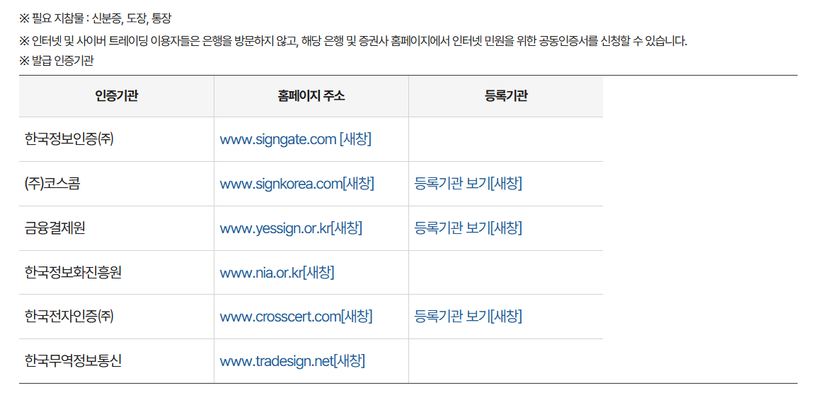 은행별 공동인증서 발급 페이지 바로가기