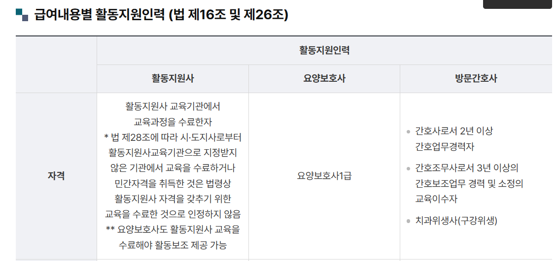 - 보건복지부 지정 기관에서 시행하는 장애인활동지원사 양성 교육을 이수한 자