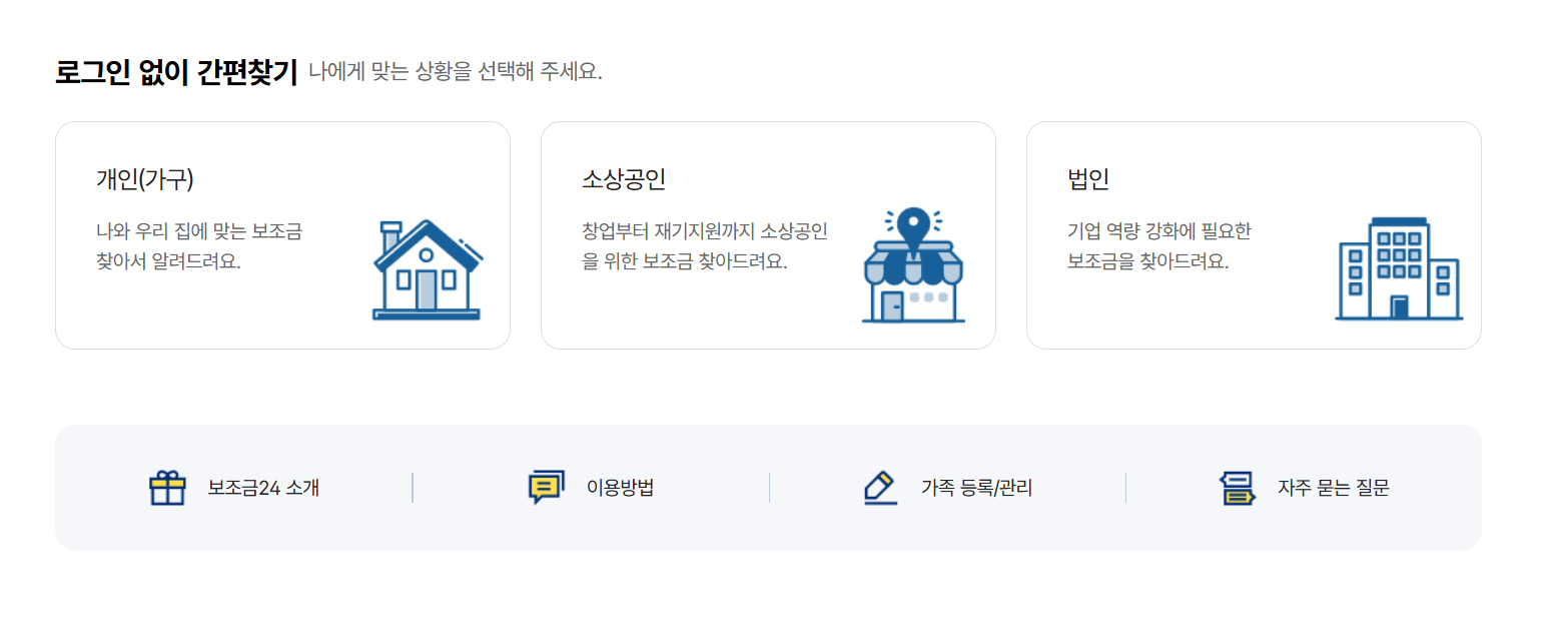 이외에도 보조금24는 정부지원금, 바우처 등을 조회하고 신청할 수 있는 맞춤형 서비스입니다. 로그인 후 개인 맞춤 혜택을 확인하거나, 비로그인 상태에서도 혜택을 간단히 검색할 수 있습니다.